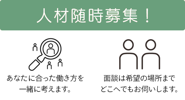 企業さまと派遣スタッフとの関係が円滑に運び、良い関係を築いてもらうために、採用後も定期的に派遣スタッフを来訪し、企業さま、派遣スタッフ双方が安心して業務ができるようサポートいたします。